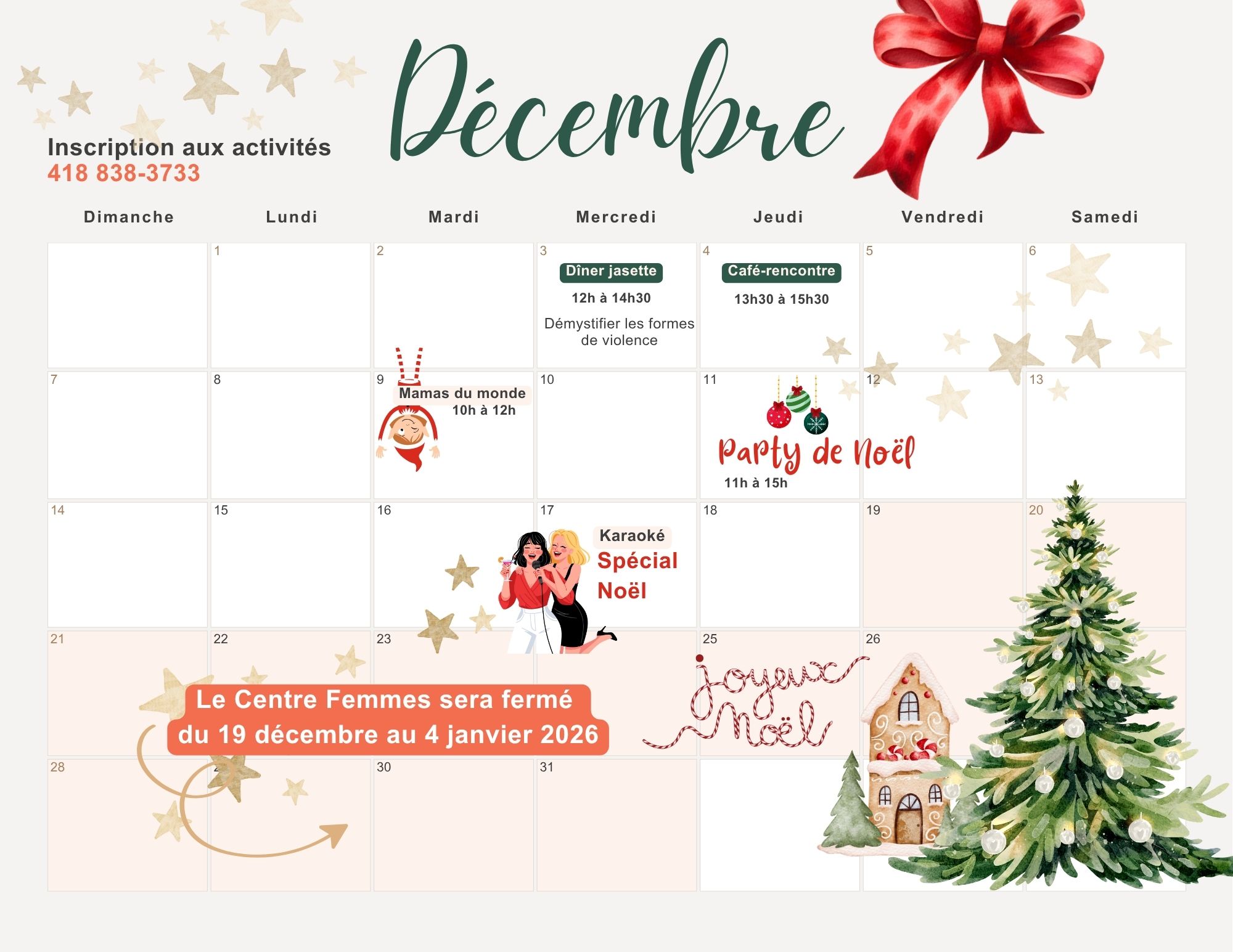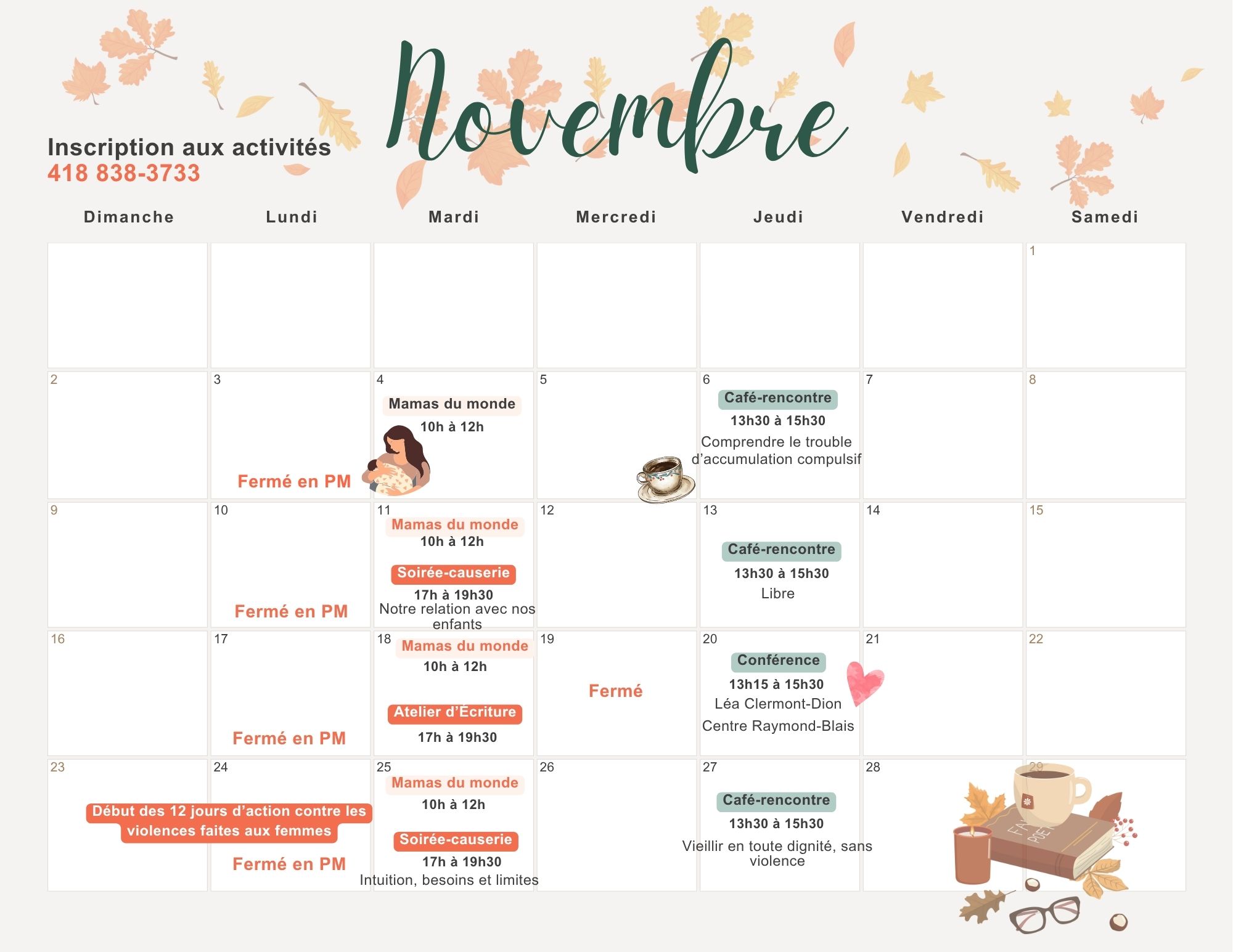 Le Centre ouvre ses portes aux mamas québécoises et d’ailleurs accompagnées de leurs enfants, Un espace inclusif et bienveillant pour créer des liens entre femmes de toutes origines, partager nos histoires et célébrer nos richesses culturelles. Discussions | café |...
